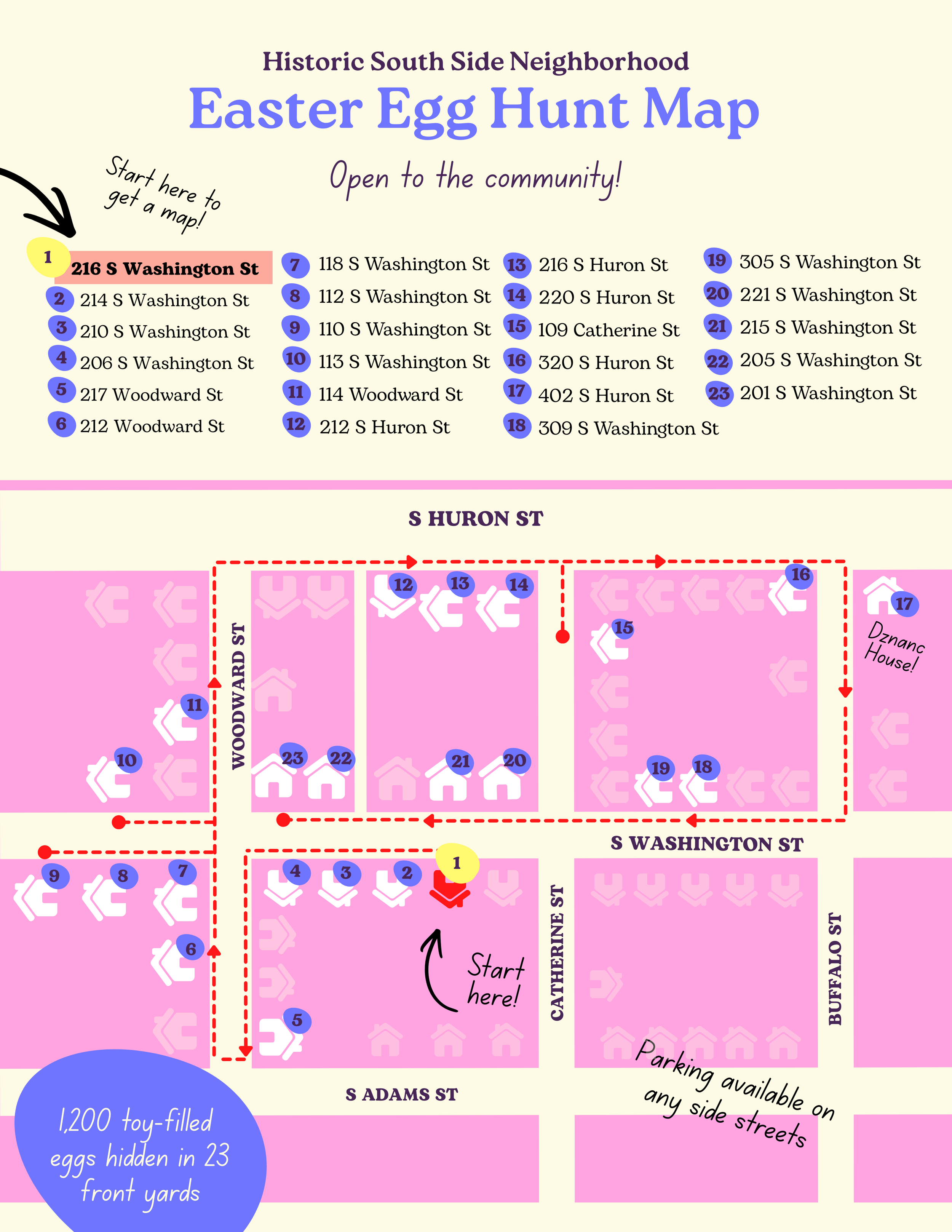 FRONT YARDS ONLY: The eggs will be in the front yards in the grass, please do not go in backyards or on porches.